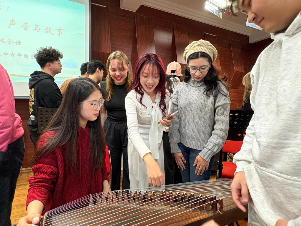 活动现场,青年国乐团带来扬琴、二胡等民乐器的经典曲目展演。琵琶弦音婉转悠扬,唢呐曲调高亢嘹亮,极具感染力的表演赢得了留学生的阵阵掌声。姚金佳老师还详细讲解了乐器的历史渊源、构造特点与演奏技巧,引导留学生近距离观察感受。