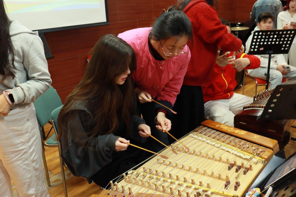 表演结束后,留学生们上台体验了各类乐器的用法。大家踊跃参与,在乐团成员的指导下尝试了古筝、堂鼓、笛、笙演奏,亲身解锁民乐乐趣。
