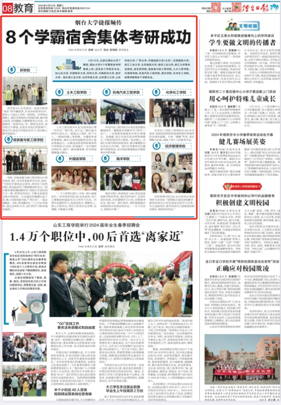 《烟台日报》4月24日08教育版刊发《bob体育在线app捷报频传 8个学霸宿舍集体考研成功》