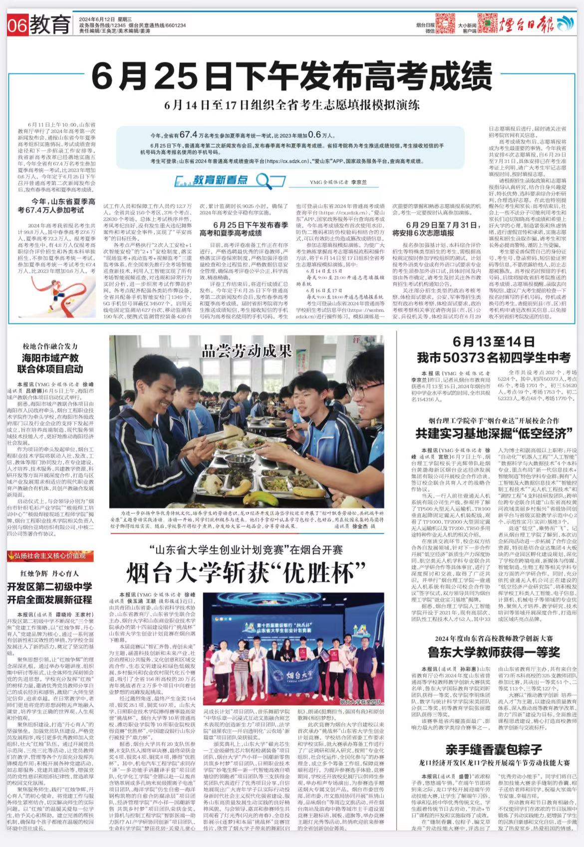 《烟台日报》6月12日06教育版刊发《“山东省大学生创业计划竞赛”在烟台开赛 bob体育在线app斩获“优胜杯”》