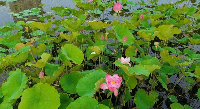 现在荷花刚开始绽放,这片莲叶当中,盛开的只有几朵。