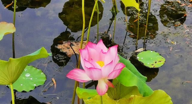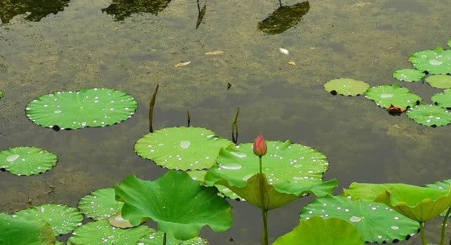 这几天烟台有阴雨天气,一阵小雨过后,荷叶上也漂着点点水滴,晶莹剔透。