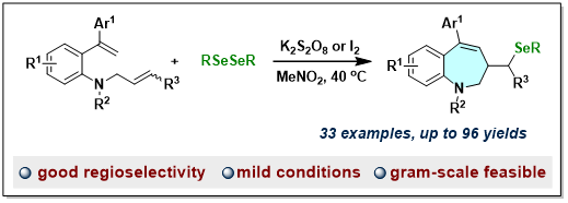 有机硒化合物,尤其是硒杂环化合物,因其在医学和材料科学中具有显著的应用价值而被广泛研究。目前,已有多种构建硒杂环化合物的方法相继被探索和报道。其中,由二硒醚化物促使的环化反应是最具代表性的一种策略。然而,该领域所涉及的反应主要集中在构建具有5元或6元环的杂环产物,而专门用于构建7元硒杂环的方法很少报道。在仅有的几例报道中,主要以芳基-炔烃类结构为底物,反应中或需要化学计量的金属氧化剂(FeCl3),或受到二芳基二硒化物的限制(仅有二苯基二硒化物研究),进一步影响了反应的实际应用。