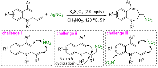 N-杂环化合物是合成和医药化学中常见的分子骨架,并且是非常有价值的合成前体,可以进一步转化为一系列有价值的结构单元。此外,在世界销售排名前100的药物分子中,含氮杂环占比接近一半。因此,N-杂环的有效构建一直是有机合成研究的热门领域。目前,采用硝基自由基诱导的加成环化制备含硝基7元氮䓬的方法尚无报道。近日,我校化学化工学院有机方法学团队,孙凯课题组利用自由基串联环化策略,成功实现了7元氮杂环的构建工作,制备了系列结构多样性的7元氮杂环(Chem. Commun., 2022,DOI:10.1039/D2CC02688K)。