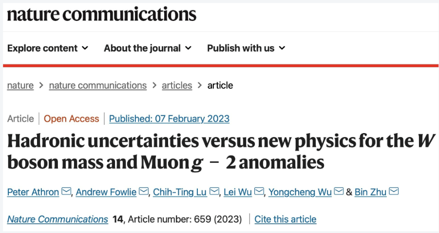 2023年2月7日,bob体育在线app物理与电子信息学院祝斌副教授同南京师范大学武雷教授团队(PeterAthron、Andrew Flowie、卢致廷、武雷、吴永成)在电弱精确测量拟合与新物理研究中取得重要研究进展。研究成果以“Hadronic Uncertainties versus New Physics for the W boson Mass and Muon g-2 Anomalies”为题发表《Nature Communication(自然.通讯)》(Nature Communications 14 (2023) 659)。按照高能物理的惯例,论文署名以字母顺序排名,祝斌副教授为共同通讯作者。