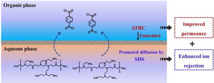 近日,我校赵玉潮教授课题组以聚乙烯亚胺和对苯二甲酰氯为单体,基于界面聚合反应制备了荷正电纳滤膜,并利用表面活性和塑化剂对膜表面电荷和孔径进行协同调控,实现了纳滤膜分离性能的综合提升,渗透通量达9.7 L∙m-2∙h-1∙bar-1,且Mn2+、Ni2+、Cu2+和Cd2+的脱除率均达到为90%以上。