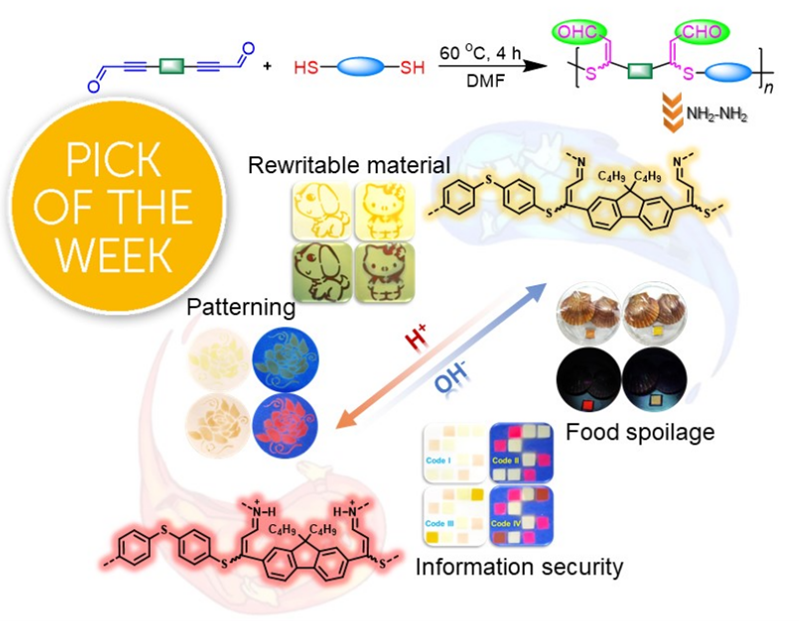 酸碱平衡是生物体赖以生存的关键,发展具有监测及调控酸碱状态的新型功能材料对于食品、医学、环境科学等领域具有重要研究和应用价值。近日,bob体育在线app环境友好高分子团队与华南理工大学秦安军教授团队合作,建立了一种无催化醛基活化内炔与巯基的点击聚合,成功制备一系列多功能聚硫醚。利用该聚硫醚结构中的高反应性醛基及荧光芴基,不仅可实现肼的高灵敏、选择性检测;而且反应新生成亚胺键上的氮原子在不同酸碱环境中会发生可逆的质子化/去质子化反应,由此产生的分子内电荷转移过程使得聚合物光物理性质发生系列变化,实现其在多色图案化、复写材料、四重信息加密及食品保鲜监测等多场景的应用。