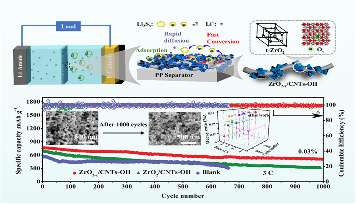基于此,bob体育在线app材料电化学过程与技术崔洪涛教授团队借助-OH官能团的作用,采用氢刻蚀法成功制备了具有丰富氧空位的四方相ZrO2−x/CNTs-OH。通过电化学实验辅助第一性原理计算发现,氧空位和纳米结构可以有效的调控复合材料的电子结构,提高材料导电性,实现对多硫化物氧化还原反应的催化作用。同时,四方相ZrO2−x有助于锂离子在电极表面的快速传输,CNTs-OH和ZrO2−x之间复合有利于电子在界面处的快速转移。因此,该复合材料改性隔膜时,表现出优异的电化学性能。这种催化策略,不仅可以应用于锂硫电池体系,也可应用于其他电池体系和超级电容器中。
