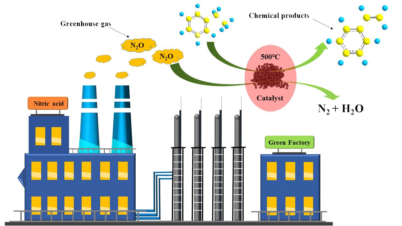 温室气体过量排放引起的全球变暖是国际社会普遍关注的环境问题。虽然氧化亚氮(N2O)在大气中的浓度较低,但其温室效应潜值(GWP)是CO2的310倍,是《京都议定书》限制排放的六种温室气体之一。N2O还破坏大气臭氧层,对生态环境构成了严重威胁。因此,有效减排N2O废气是很有意义的研究课题。