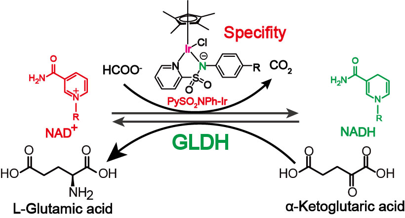 基于此,我校祁彩霞教授团队在课题组前期开发的负氮型超高活性辅酶NADH再生吡啶酰胺有机铱催化剂PyCONPh-Ir的基础上(Catalysis Science & Technology. 2021, 11, 7982-7991.),通过调变配体电负性,开发了一款新的吡啶磺酰胺型铱催化剂PySO2NPh-Ir,其不仅保留了对辅酶NADH超高的再生活性,且相较于吡啶酰胺型催化剂,其对于芳香醛、醌类化合物以及α-酮戊二酸的加氢活性均明显较弱,展现了更出色的辅酶NADH再生选择性,也更加适用于化学-酶级联催化体系的构建。进而,将有机铱催化剂PySO2NPh-Ir与L-谷氨酸脱氢酶GLDH相结合,实现了对L-谷氨酸的高效制备(图1)。