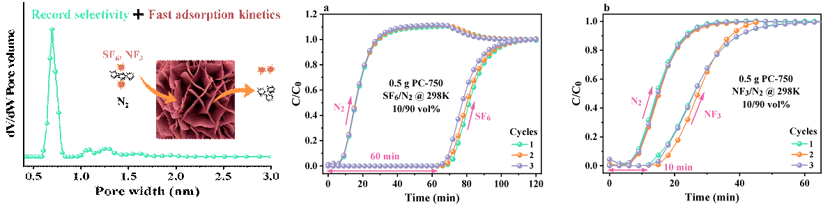 bob体育在线app徐秀峰教授课题组较早开展了SF6、NF3等新型温室气体的减排研究,利用化学分解方法(催化水解或无水分解)将这些气体转化为低害物质。相比之下,将SF6、NF3从工业废气中吸附分离并回收再利用是一种更有效的资源化处理方法。为此,本课题组以柠檬酸钾为原料,经一步碳化活化,调控纳米片状炭基吸附剂的孔结构和表面性质,增强了吸附剂与SF6、NF3分子的相互作用,提高了吸附剂在常温常压下对SF6的吸附量(4.09 mmol·g-1)和吸附选择性(10%SF6/90%N2的分离比436.4),对10%NF3/90%N2的分离比达到61.4,优于文献报道的吸附剂。研究结果以“Highly-efficient separation of SF6/N2and NF3/N2with record selectivity on one-step synthesized carbon nanosheet”为题,发表在化工分离领域权威期刊《Separation and Purification Technology》。作为资源化减排SF6、NF3废气的一种有效方法,该工作丰富了对吸附分离含氟温室气体科学规律的认识。
