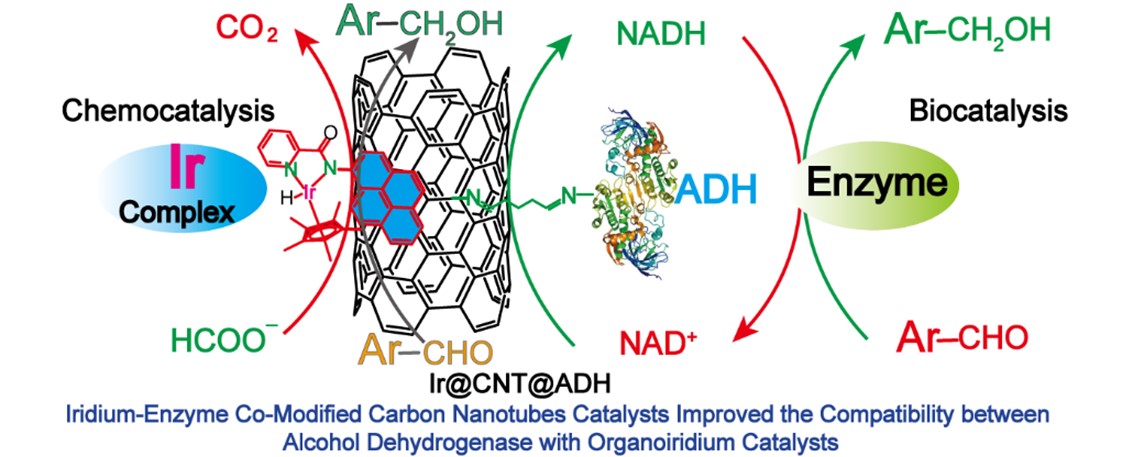 该研究通过两种相互独立的温和偶联方式,将新型的辅酶NADH再生有机铱络合物和乙醇脱氢酶(ADH)依次锚定在碳纳米管材料表面,发展了一种非均相的有机铱-酶级联催化剂,显著改善了有机铱络合物和含巯基生物酶(ADH)之间的生物相容性问题,实现了酶催化芳香醛制芳香醇过程中,高成本辅酶NAD+/NADH的高效循环利用(图1)。该成果提出的策略,将有望降低生物合成生产成本,并促进化学-生物协同催化体系的工业应用。上述工作得到了国家自然科学基金(21904131)、烟台市科技创新发展计划项目(2023JCYJ075)、山东省自然科学基金(ZR2022MB082, ZR2022QB120, ZR2023MB023)等项目的资助。(文/图赵立军)