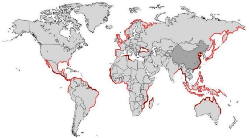 图1 世界各地入侵藻的分布图(红线表示入侵藻的分布)