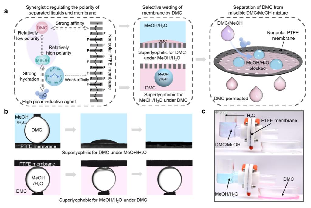 基于此,bob体育在线app刘洪亮教授团队设计开发了一种超浸润膜分离系统,实现了DMC和MeOH的低能耗、高效分离,分离通量高达1090 L m-2h-1,比传统的膜分离技术高2-3个数量级。该超浸润膜分离系统以多孔聚四氟乙烯(PTFE)作为超浸润膜,环保的水分子(H2O)作为液体诱导剂,协同利用非极性的PTFE多孔膜和较低极性DMC之间的非极性作用以及高极性H2O和较高极性MeOH之间的强氢键作用,使DMC快速、选择性地透过PTFE膜。得益于超浸润膜易集成的特点,团队设计了基于超浸润分离膜和渗透汽化膜的膜分离组件,DMC的纯度大于99.4 wt%,在DMC的实际生产中展现了巨大潜力。