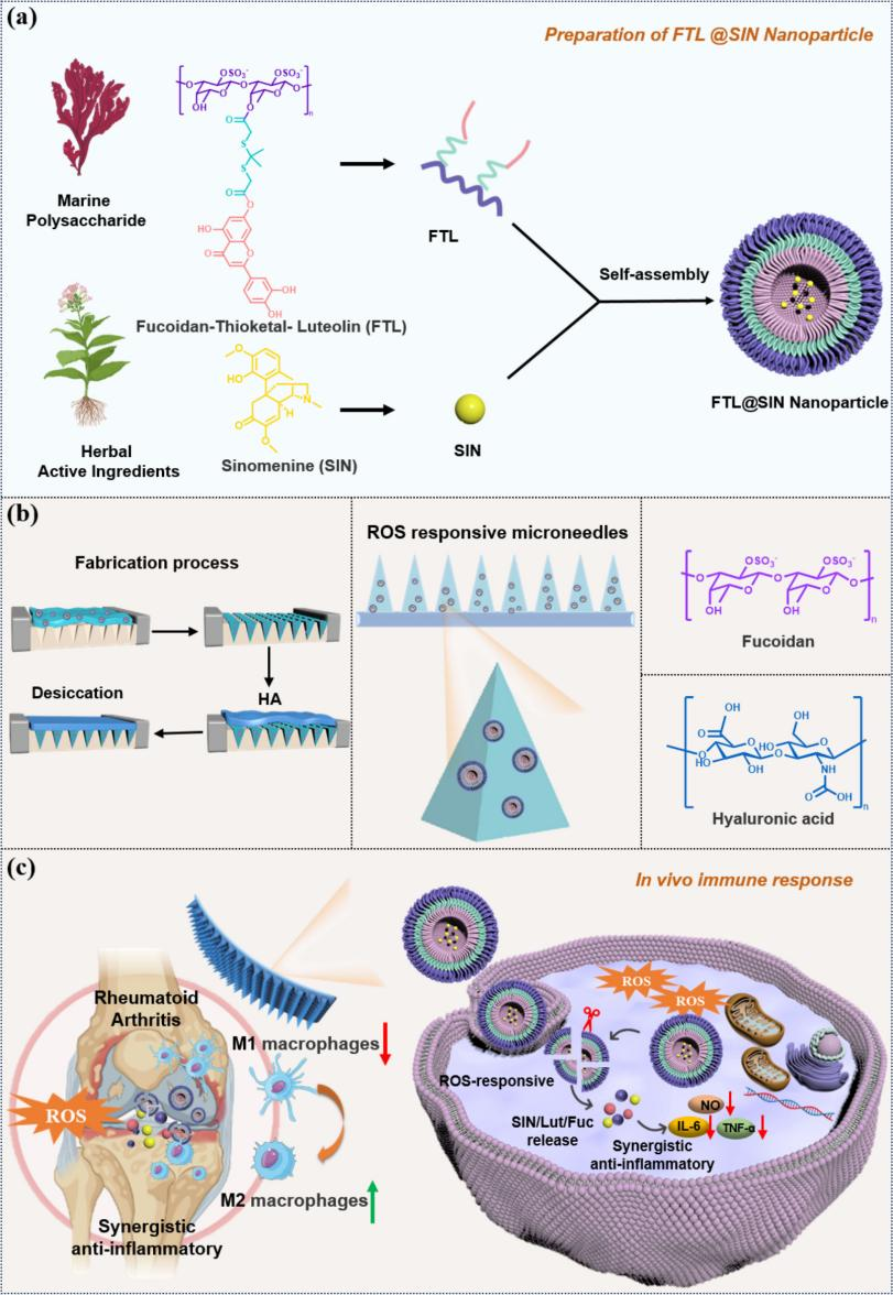 近期,bob体育在线app陈大全教授团队,针对目前类风湿关节炎治疗存在的弊端和从中药组分中得到启发,选择了具有免疫抑制活性的生物碱类化合物分青藤碱(Sinomenine,SIN)作为模型药物,将中医药理论、纳米医学与微针经皮递药系统相结合,构建了活性氧(ROS)响应型纳米颗粒与可溶性海洋载体微针联用的新型经皮给药递送系统(FTL@SIN MNs)。选择海洋中药昆布组分—岩藻多糖(Fucoidan,Fuc)为亲水骨架,以山东道地中药金银花组分木犀草素(Luteolin,Lut)为疏水端,并引入ROS响应型的硫缩酮键(Thioketal,TK)得到两亲性载体材料FTL。利用透析法将低水溶性药物SIN包封于FTL的疏水内核中,得到载药纳米颗粒FTL@SIN,并将其负载到以高分子量的Fuc为主要基质,采用真空浇铸法制备可溶性微针中,从而赋予可溶性微针ROS响应能力,最终得到新型经皮给药递送系统FTL@SIN MNs。显着降低了巨噬细胞炎症,同时减少了关键的促炎细胞因子,并将 M1 型重新极化为 M2 型,从而改善了滑膜炎症,促进了软骨修复(图1)。该研究为类风湿性关节炎的治疗干预提供了一条有前途的方法。