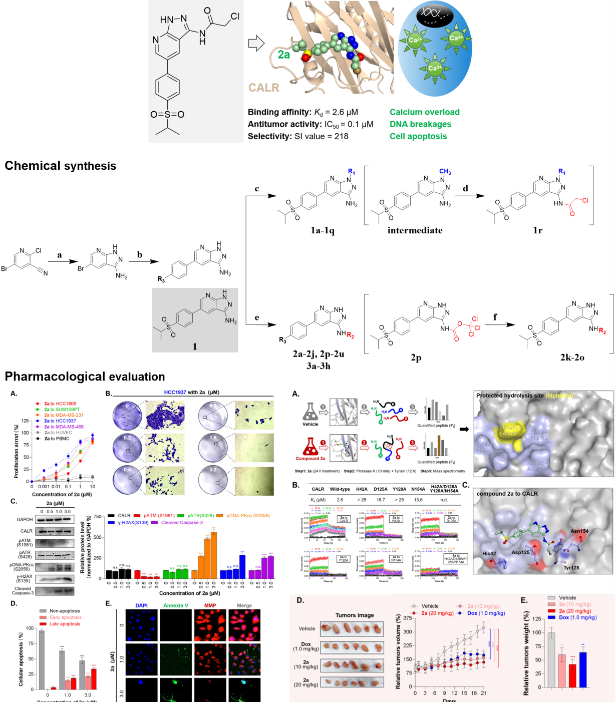 近日,bob体育在线app王洪波、殷齐坤课题组通过对CALR进行结构分析,构建了含48个新型吡唑并吡啶类衍生物的CALR配体库。通过在其母核7位和9位引入多样化末端基团(如苯乙酮和丙酰氯类似物),并在1位扩展取代基多样性(如吗啉基、醛基和羟基)以讨论化合物与CALR结合的构效关系。其中,化合物2a被发现具有高亲和力(Kd= 2.6 μM)及强效抗TNBC活性(IC50= 0.1 μM)。机制上,化合物2a能在体外及细胞内结合CALR的N端结构域,通过TMCO1通道引起内质网钙离子的释放,诱导TNBC钙超载和细胞凋亡。体内研究表明,2a能显著抑制小鼠模型中TNBC异种移植瘤的生长(IR=84.3%,20mg/kg,i.p.),并无明显蓄积毒性。该研究发现了首个结合模式明确并具有抗肿瘤活性的CALR配体,为化学靶向CALR用于TNBC的治疗提供了化学新分子与理论基础。