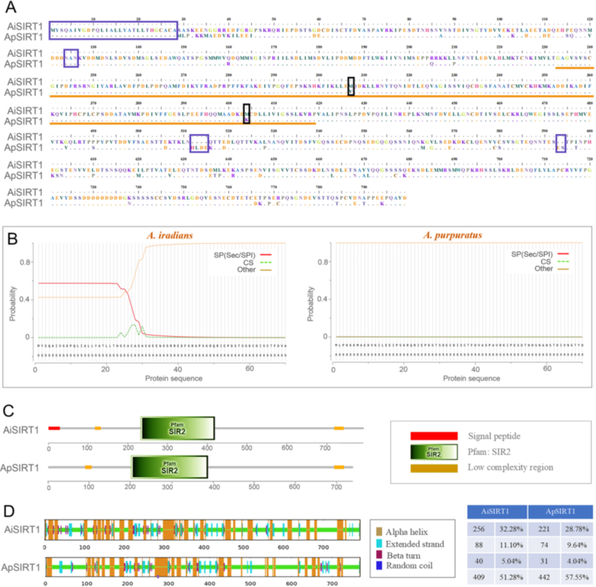 图一AiSIRT1和ApSIRT1的序列(A)、信号肽(B)、结构域 (C)及二级结构(D)的差异。
