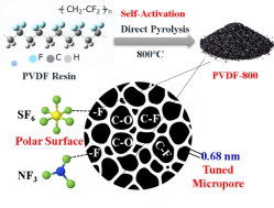 利用聚偏氟乙烯树脂的直接热解,实现了自活化,并结合原位引入的极性基团,成功制备了PVDF-800吸附剂。该研究强调了同时优化孔径和表面极性对于开发高性能F-gas分离吸附剂的重要性。