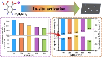 利用原位活化法,通过钾盐与有机前驱体的协同作用,一步合成出KHP-T系列碳材料。该方法巧妙地将碳源和活化剂融合,实现碳材料的一步合成。通过系统调控热解温度,精准控制了0.36-0.52 nm和0.52-0.80 nm两个关键尺寸范围的超微孔体积,优化了吸附剂的孔结构。