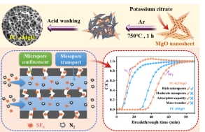 利用柠檬酸钾与MgO纳米片协同作用,制备出PC-xMgO吸附剂。MgO纳米片在此过程中扮演了“空间隔离剂”,有效防止了PC热解过程中产生的纳米片聚集,从而构建出兼具微孔限制和介孔扩散的协同孔结构,实现了SF6吸附容量、分离选择性以及扩散速率的优化平衡。