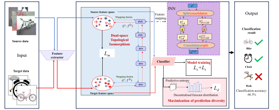 该研究针对跨域图像分类问题中,因图像数据分布差异导致模型在新域性能下降的现象,摒弃传统方法将不同域特征对齐到单一共享空间的思路,使用“双空间拓扑同构”(DTI)范式,利用可逆神经网络在源域和目标域之间建立一种精确双向映射关系。由于该映射具有可证的可逆性与连续性,从而在域对齐过程中保留了数据固有的拓扑结构,实现了更精确的图像分类效果。