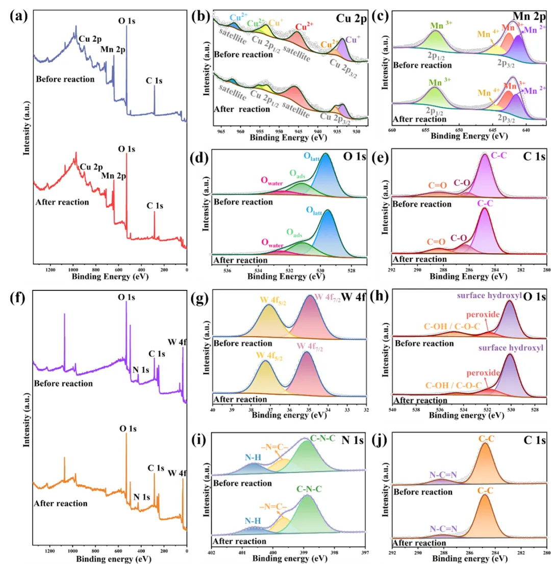 在反应前后,利用CMO电极和WCN电极的XPS光谱研究了反应降解过程。可以看出,反应前后各元素在CMO电极上特征峰的相对位置变化不大,然而,这些元素的百分比各不相同。CMO电极上的部分Cu+参与了催化反应,并转化为Cu2+,Mn2+的相对浓度下降,而Mn3+的相对浓度上升。晶格氧和表面氧相对数量的变化表明氧原子参与了这一过程,并负责原子的重组。反应前CMO电极中OLatt相对浓度较大是由于晶格膨胀或变形,产生了更多的缺陷,有利于氧空位和表面羟基的形成。反应后的CMO电极中OLatt的相对浓度降低。反应后的WCN电极表面羟基含量降低,过氧化氢含量增加,证明WCN表面发生了氧还原反应,生成了过氧化氢等物质。
