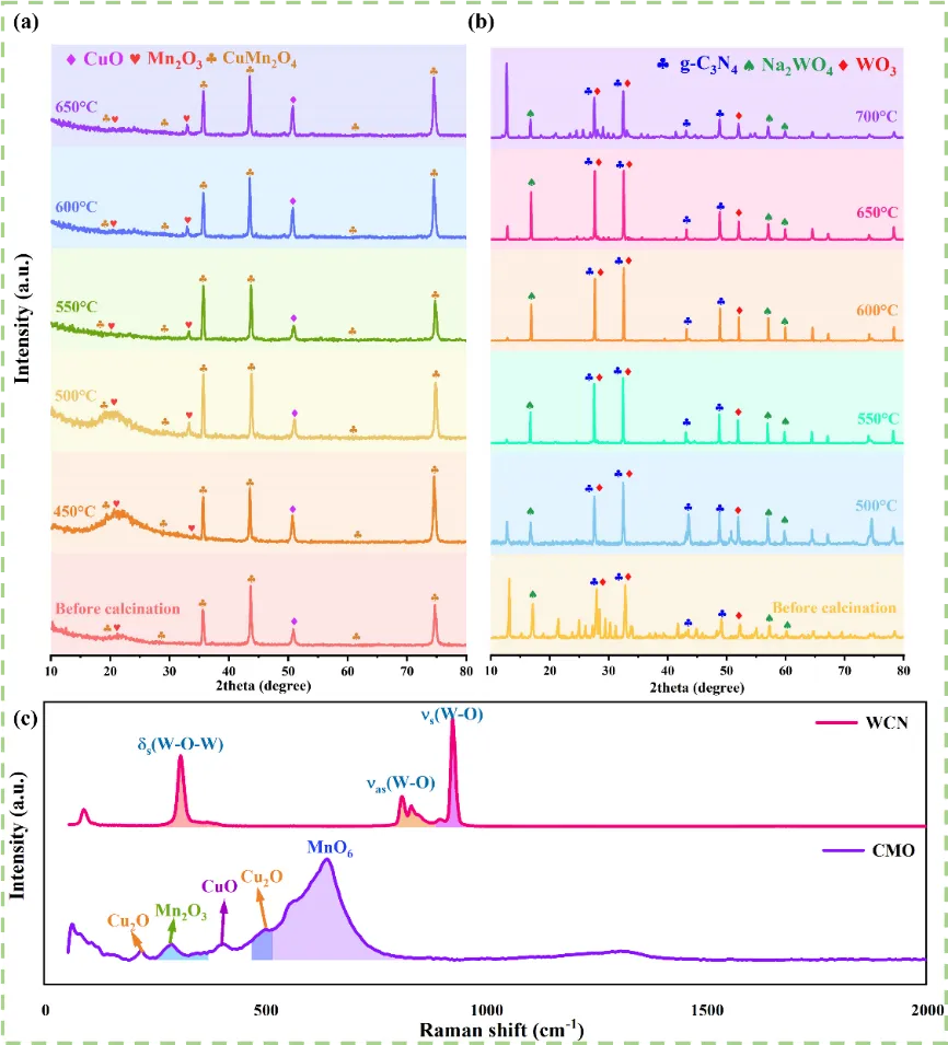 为了确定CMO电极和WCN电极的晶体结构,我们进行了X射线衍射(XRD)研究。这些证明了在WCN电极上成功合成了WO3和g-C3N4光催化剂。根据XRD图谱和Scherer公式=计算晶体尺寸,CMO和WCN电极的平均晶体尺寸分别为25.91纳米和52.77纳米。拉曼测试进一步评估了WCN和CMO电极上的催化剂颗粒的结晶度。CMO电极的拉曼光谱显示了550和650cm-1之间的独特峰值,这被归因于MnO6振动单元的对称拉伸模式。在制备CMO电极的过程中,还涉及到Cu和Mn氧化物的合成。观察到Cu2O的特征峰在219 cm-1和503 cm-1,Mn2O3和CuO的特征峰分别在285 cm-1和404 cm-1。这些证明了CuMn2O4尖晶石的成功合成。WO3的拉曼光谱在309 cm-1、810 cm-1和926 cm-1处含有三个主要的拉曼带,分别对应于W-O-W键的弯曲模式(δs)、W-O的不对称拉伸模式(νas)和W-O的对称拉伸模式(νs)。由于其荧光特性,g-C3N4的峰值很难在拉曼光谱中被发现。