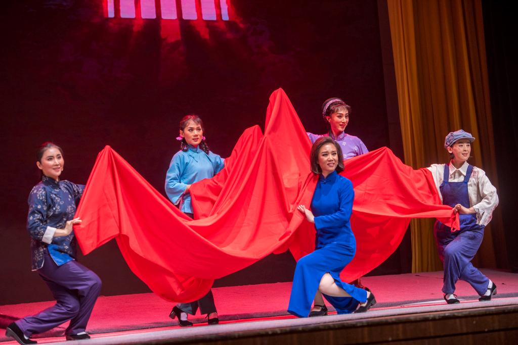 新版《江姐》由七场戏组成,长达两小时的演出跌宕起伏、场场相扣。从山城重庆到华蓥山下,再到中美合作所的严刑拷打,江姐及红岩先烈们坚定的意志与对党和人民无比忠诚的情怀,传神地融入到每一段唱词、每一个动作中,令台下师生感动不已、潸然泪下。“请代我向党来汇报,就说我永远是党的女儿”,从容赴死的“江姐”深情地唱起《不要用哭声告别》,将整场演出的氛围推向高潮,现场师生用接续不断的掌声向英雄们致敬。