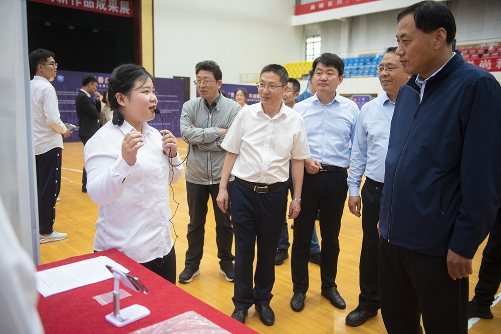 【本站讯】青春向党,科创报国。10月9日,bob体育在线app大学生科技创新作品成果展在大学生活动中心举行,集中展出了学校近三年“挑战杯”系列竞赛的省级国家级获奖项目成果,60余支参展团队进行了实物展示、视频演示、现场讲解,吸引了全校数千名师生到场观摩学习。党委书记张殿臣、校长段培永、副校长毕可志及相关职能部门、相关学院负责人到场观摩指导。