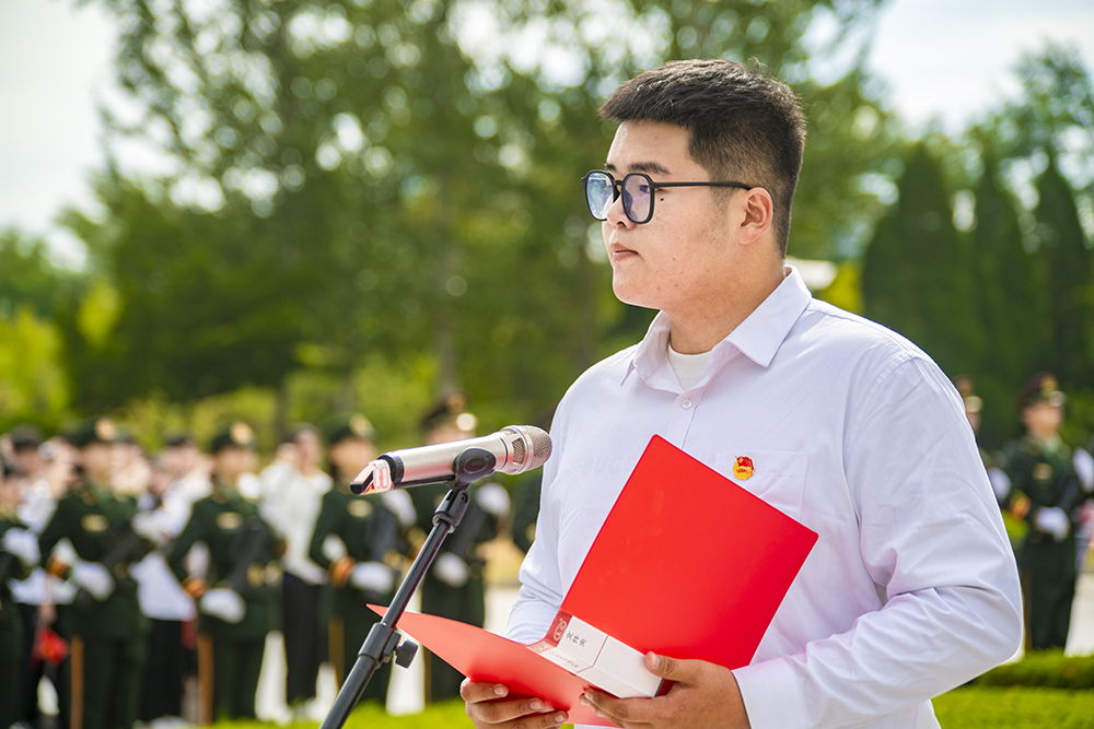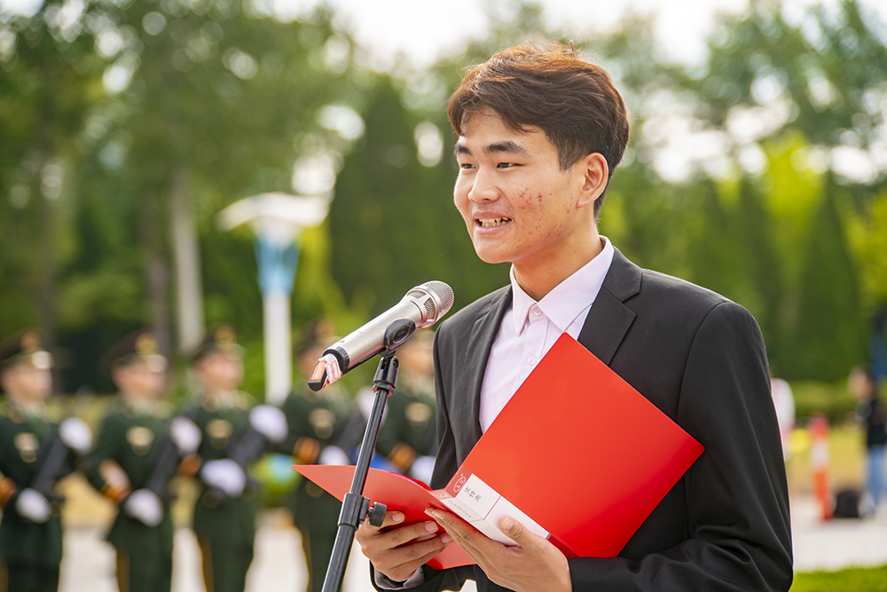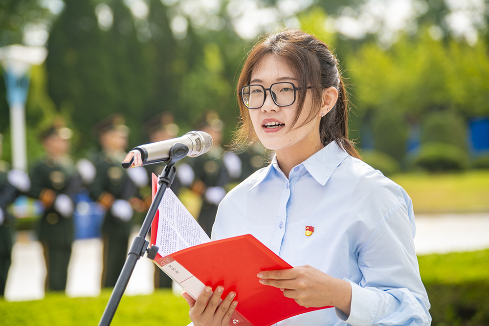 “我以青春的名义,庄严宣誓:热爱我的祖国,紧跟党的步伐,做祖国母亲忠实的拥护者,坚持‘守信、求实、好学、力行’的校训……”学生代表、化学化工学院2020级高分子材料与工程专业马晓宇同学带领现场学生代表在鲜艳的五星红旗下庄严宣誓。