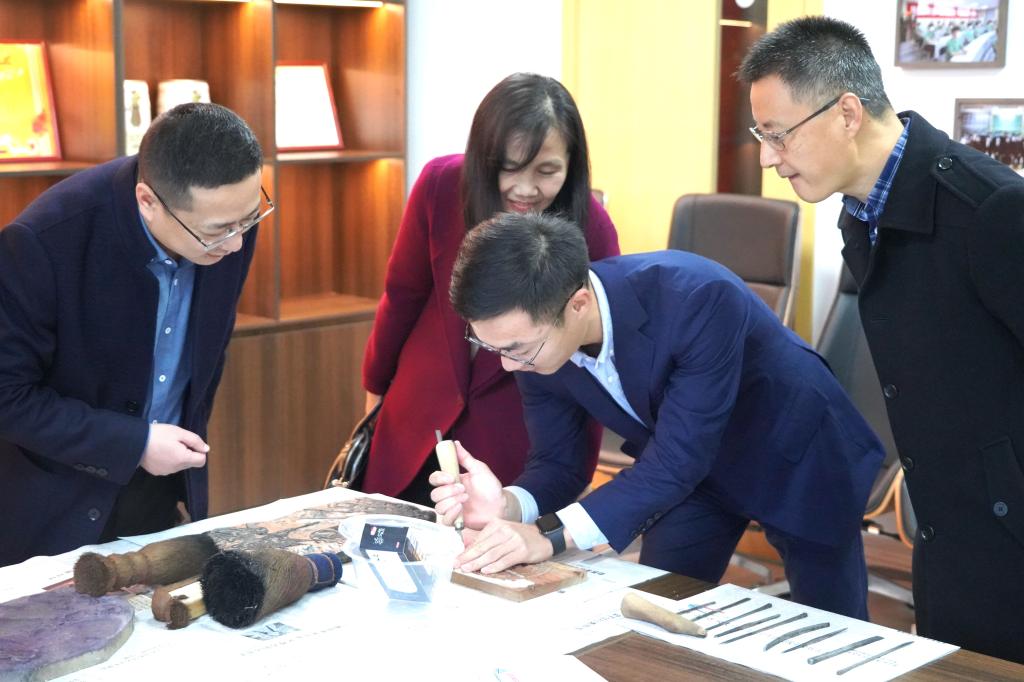 与会人员前往学院非遗体验工作坊,体验东昌府木版年画制作方法。