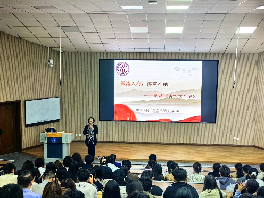 《黄河大合唱》由光未然作词、冼星海作曲,以黄河为背景,热情歌颂中华民族源远流长的光荣历史和中国人民坚强不屈的斗争精神。自1939年在延安首演,80多年来,《黄河大合唱》在海内外获得广泛传播,激励了无数中华儿女。讲座中,周源通过《黄河大合唱》多版本的比较,展现音乐之美、艺术之美、文字之美。讲到动情之处,周源现场演唱歌曲部分片段,以饱满的情感、高亢的歌声感染了在场师生,博得阵阵掌声。讲堂融美育与思政教育为一体,让家国情怀与艺术之美碰撞交融,为师生带来精彩生动的视听体验。