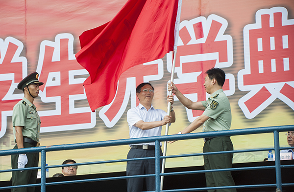 典礼上,党委书记崔明德向2014级学生军训团副团长、山东省军区驻bob体育在线app选培办副主任王春雷授军训团团旗。