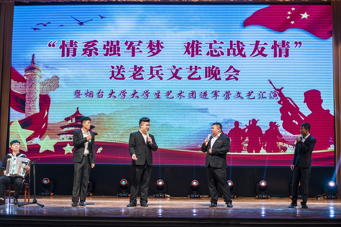 演出之前,部队官兵拉歌环节热血沸腾,烘托了全场的气氛。音乐舞蹈学院花腔女高音独唱《军营飞来一只百灵》,为退伍老兵送上部队的温馨与欢乐。歌曲《游击队之歌》《心中的力量》《啊朋友再见》《老兵你要走》通过悠扬的旋律和感人的歌词细细讲述了军旅故事,直扣官兵心弦。音乐舞蹈学院学生二胡重奏《新赛马》、萨克斯四重奏《巡逻兵进行曲》以乐器演奏的方式表现了部队官兵的昂扬斗志。舞蹈《燃梦》充满青春活力,以及饱含深情的舞蹈《母亲的麦田》,通过肢体动作展示了多彩的军旅人生。哑剧《蜕变》、情景剧《老兵的时光剪影》、军营Rap《老兵再见》展现了军旅生活的点点滴滴,战友情演绎得淋漓尽致,赢得台下观众热烈的掌声。整场演出在大学生艺术团歌曲联唱《正青春》中落下帷幕,学校领导与部队首长上台同演职人员一一握手并合影留念。