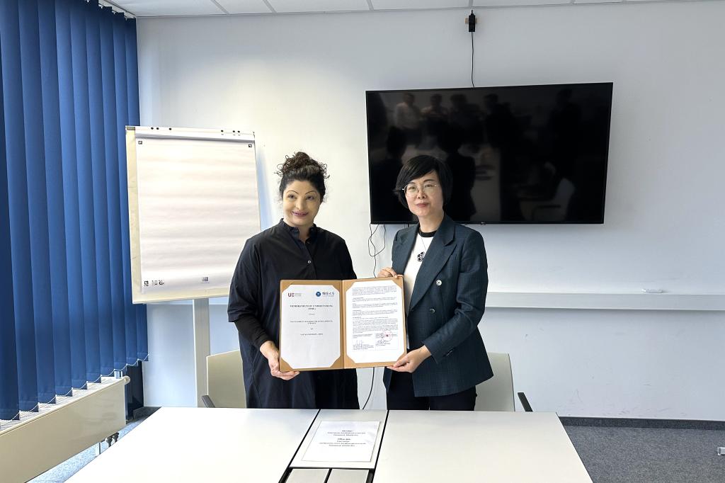 在欧洲应用技术大学,代表团与分管教学工作副校长萨沙·波塞茨基、分管国际事务副校长吉瑞·艾米纳·格森教授进行座谈。冯素玲与吉瑞·艾米纳·格森签署了合作谅解备忘录,并决定两校在软件工程专业开展双元制联合培养项目。