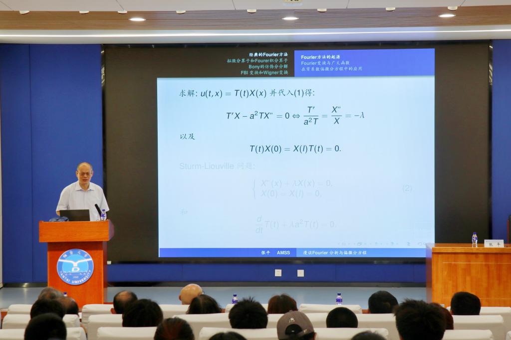 张平院士回顾了经典的Fourier分析方法,详细介绍了Fourier分析的历史背景和基本思想及其在数学、物理、工程等领域中的广泛应用,通过生动活泼的案例和抽丝剥茧的分析,使抽象的理论变得具体可感。从Fourier1822年关于热学解析理论的经典著作到Schwartz引入的分布理论,从Malgrange和Ehrenpreis关于常系数偏微分算子基本解的开创性工作到Hormander和Nirenberg引入的拟微分算子,从Bony创立的仿微分运算到Chemin关于vortex patch的著名结果……张平院士用深厚的学术底蕴和独特的讲授风格将复杂的数学理论讲得深入浅出,让在场师生感受到了数学的魅力。张平院士表示,希望烟大师生发扬锐意创新、不畏艰难的精神,挖掘和发展Fourier分析在偏微分方程前沿研究中的独特优势,开展创新性科学研究,为推动数学学科和相关学科的发展贡献烟大力量。
