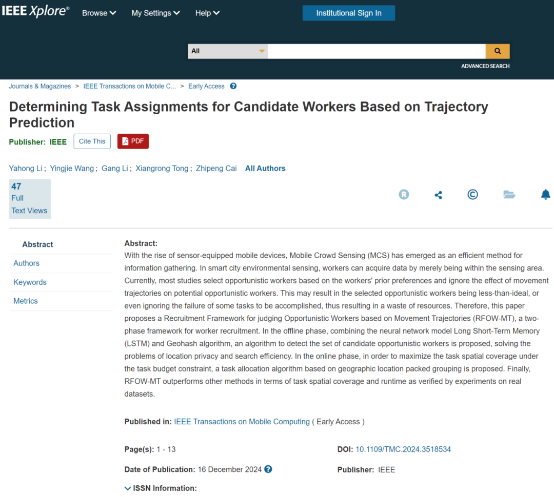 【本站讯】近日,bob体育在线app计算机与控制工程学院2022级计算机技术专业研究生李亚鸿为第一作者,计算机与控制工程学院王莹洁教授为通讯作者,bob体育在线app为第一单位,以“基于轨迹预测确定候选工人集合的任务分配”为题在国际计算机网络顶级期刊《IEEE移动计算汇刊》发表研究论文。