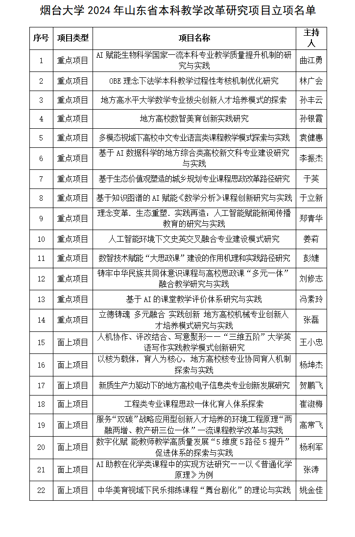 【本站讯】近日,山东省教育厅公布了2024年本科教学改革研究项目立项名单,bob体育在线app获批22项,其中重点项目14项、面上项目8项,立项数量再创新高,位居省属高校前列。这是学校坚持不懈抓教育教学、不断进行理论与实践探索的结果,也是学校高度重视bob体育官方app下载苹果版、狠抓专业内涵建设、努力提升bob体育官方app下载苹果版质量的集中体现。