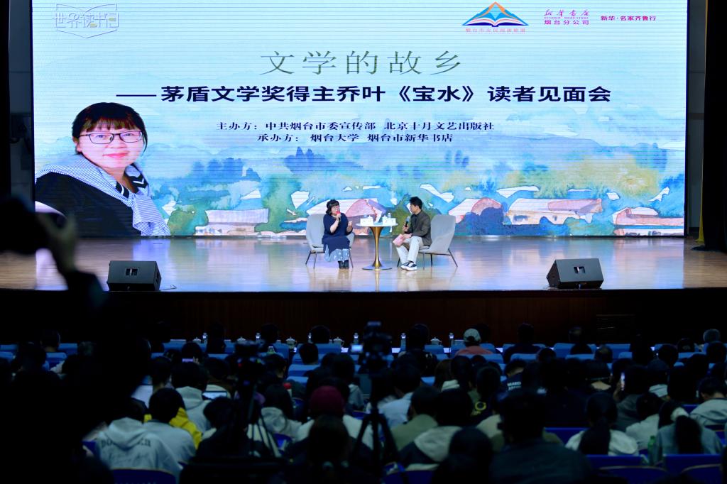 随后,烟台广播电视台主持人云天与乔叶展开交流。乔叶分享了对阅读经典的看法,她将经典作品比作屹立的高山,指出“经典不会迎合读者,却始终等待读者去探索,其价值是永恒的”。谈及《宝水》的创作,乔叶表示,故乡是她创作的重要源泉,乡土的丰富性为文学创作提供了无限可能,故乡是生长的文学,文学是精神的故乡。她还提及对烟台的美好印象,表示在烟台真切感受到了海子笔下“面朝大海,春暖花开”的意境。