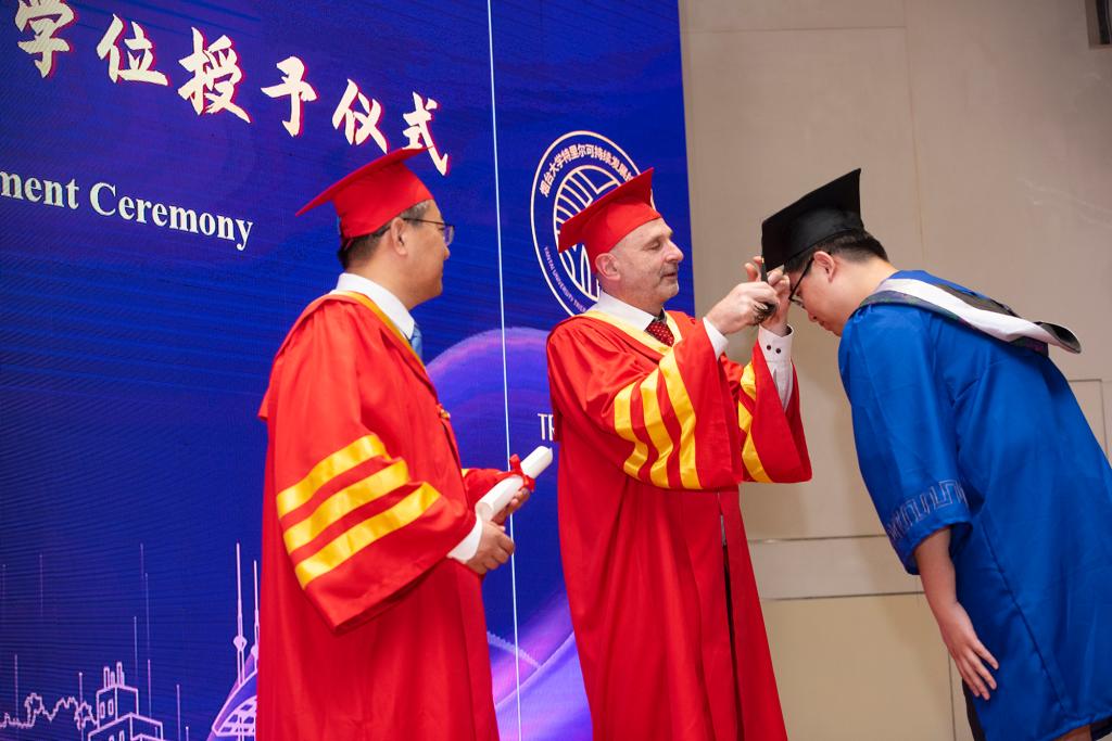 副校长王洪波与德国特里尔应用技术大学应用物质流管理研究院院长Peter Heck为毕业生拨穗正冠
