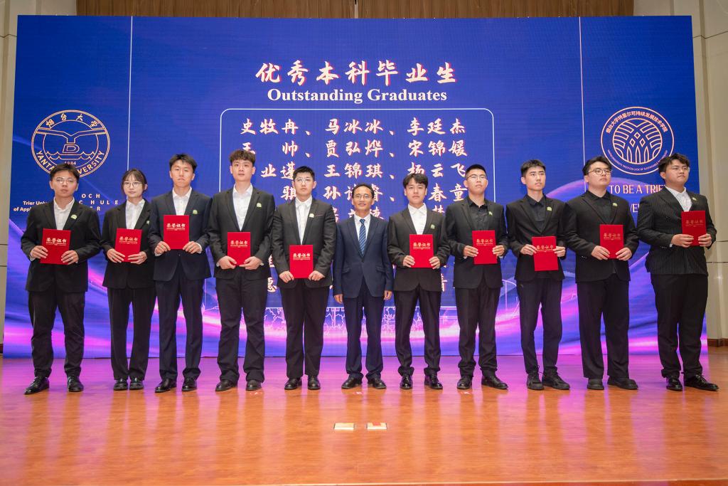 毕业典礼上,姚昌和德方代表Marco Angilella为2025届优秀毕业生及优秀毕业论文获得者颁发荣誉证书,王洪波与Peter Heck共同为毕业生拨穗正冠,中德双方教师代表深情寄语,本科、研究生毕业生代表抒发临别感怀。古典舞《拾光》以翩跹舞姿勾勒青春剪影,歌曲《Try everything》《七里香》《凤凰花开的路口》的旋律交织着欢笑与泪水。
