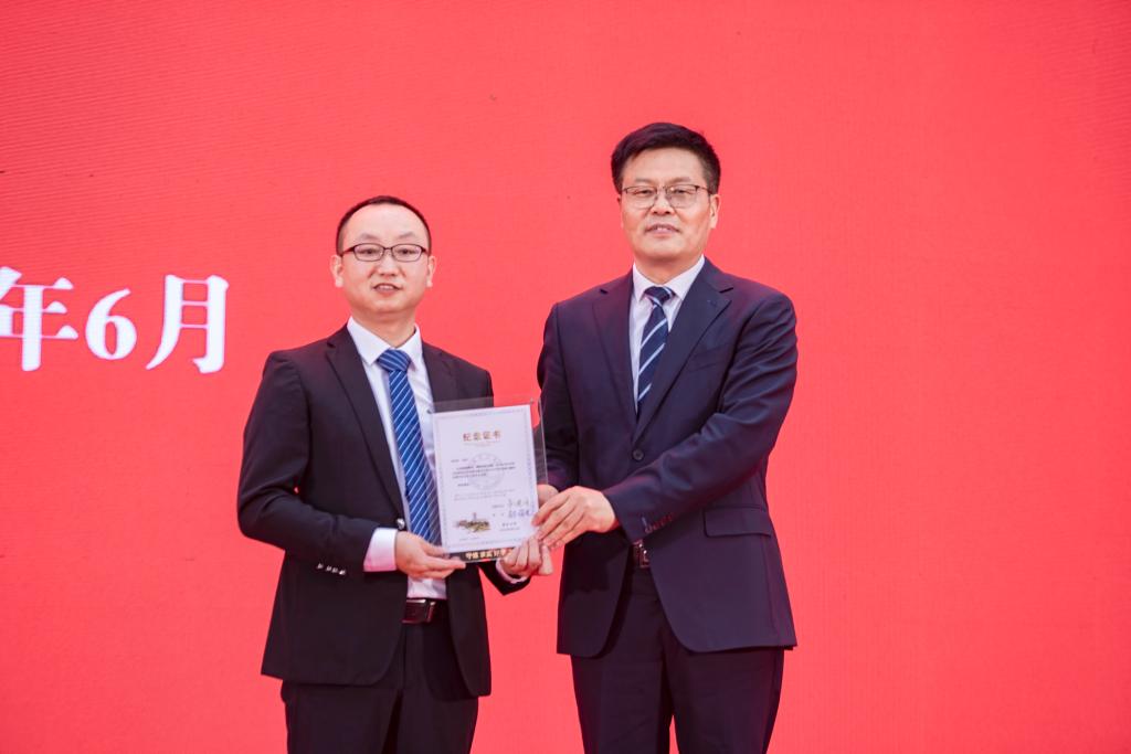 党委书记卢国强为涂桂旺校友和赵勇校友颁发纪念证书。