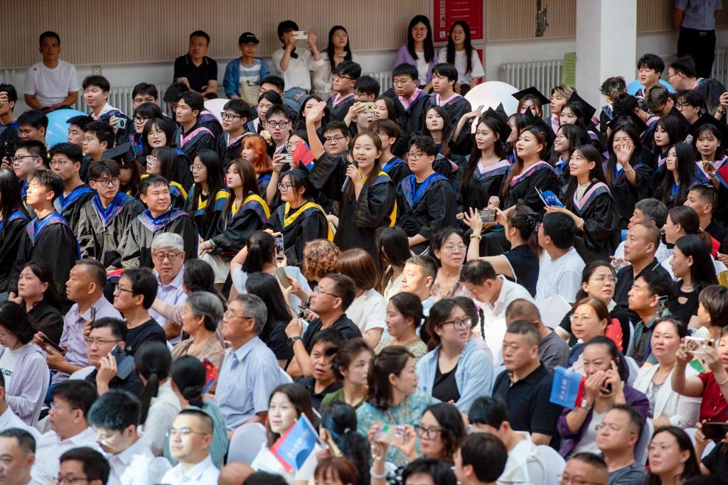 主校区本科生毕业典礼上,党委副书记白青为优秀毕业生代表颁发荣誉证书