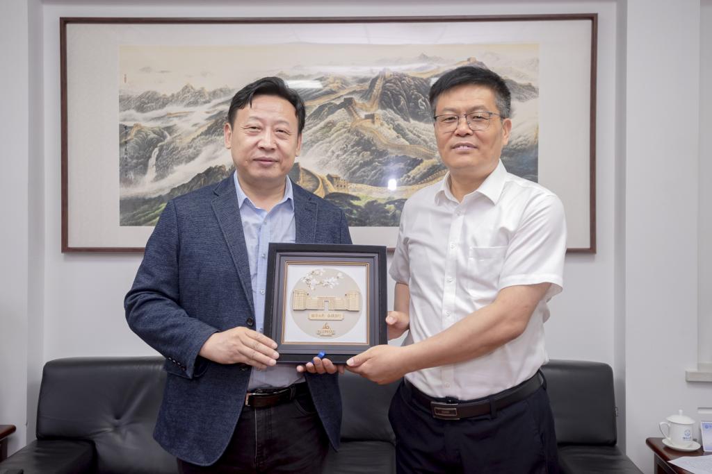 bob体育在线app党委书记卢国强(右)向长江学者特聘教授、国家特聘专家殷福星(左)赠送学校纪念品
