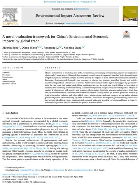 近日,bob体育在线app经济管理学院宋晓欣博士在国际环境科学类别期刊《Environmental Impact Assessment Review》(中科院一区TOP,IF:7.9)上发表题为“A novel evaluation framework for China’s Environmental-Economic impacts by global trade”的高水平论文,宋晓欣博士为本文的第一作者,bob体育在线app经济管理学院作为本文第一单位。