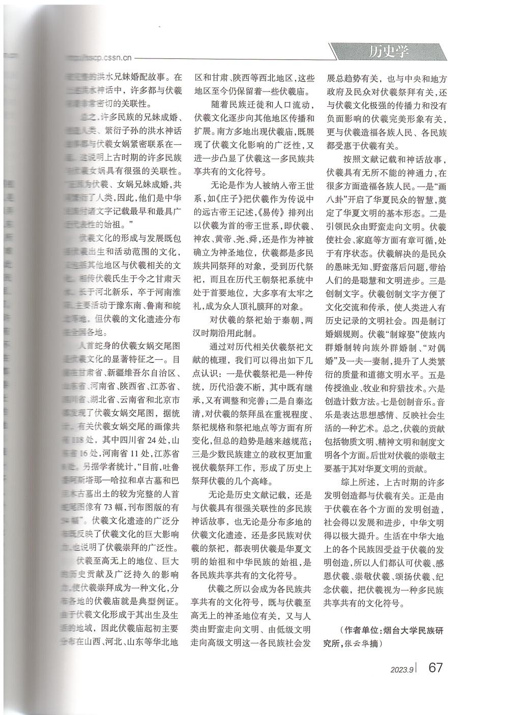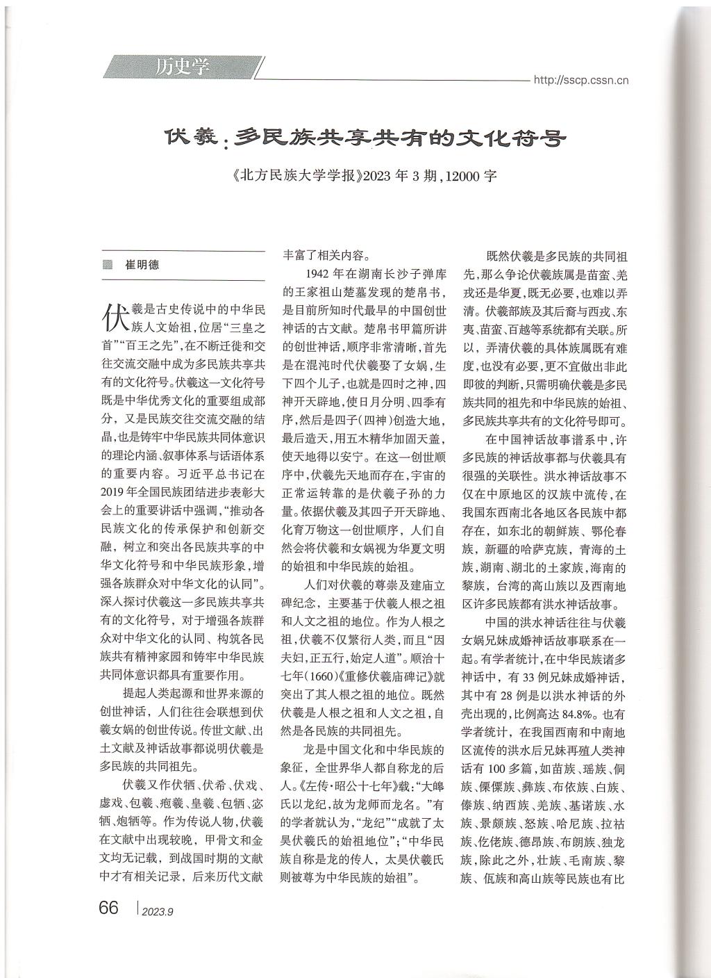 近日,《中国社会科学文摘》2023年第9期主体转载了bob体育在线app崔明德教授发表于《北方民族大学学报》2023年第3期的理论文章《伏羲:多民族共享共有的文化符号》。
