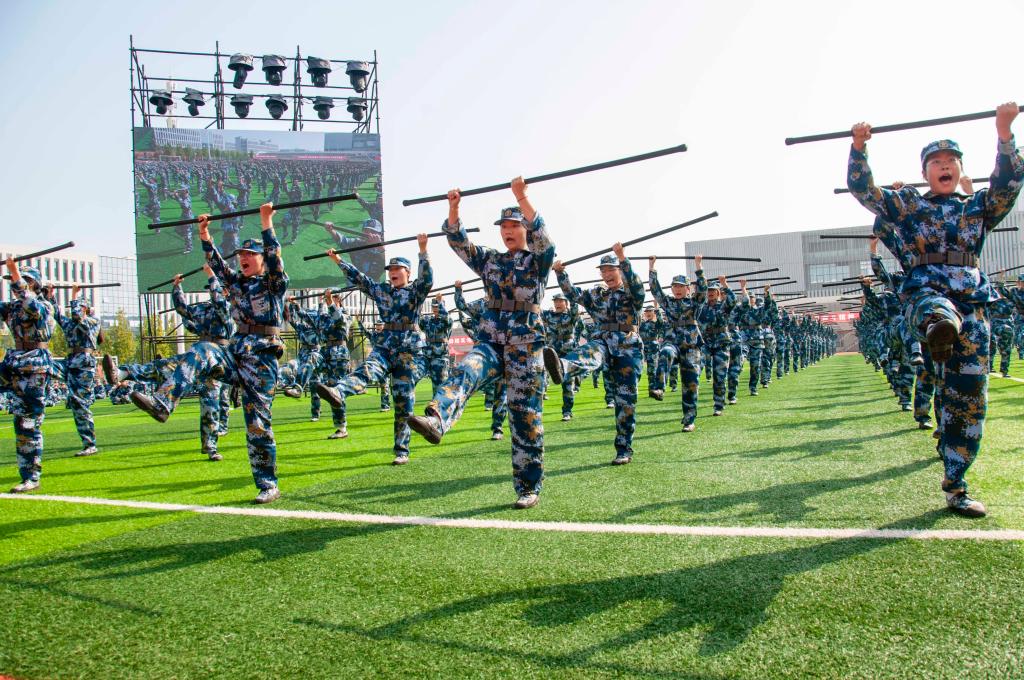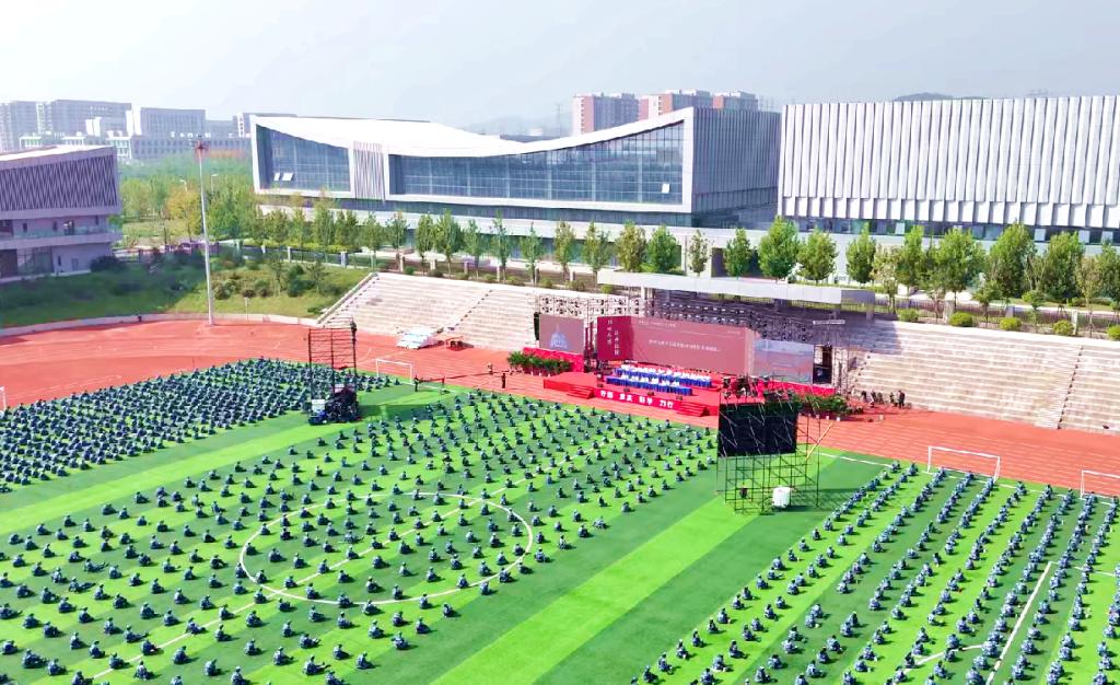 伴着雄壮的国歌,五星红旗在两校区体育场同时升起,开学典礼正式拉开帷幕。本次典礼采用两校区同步直播、实时切换的方式进行,让两校区新生共享这份属于烟园的热血与感动。看台上,两校区歌咏方阵交替唱响《强军战歌》《祖国不会忘记》《当那一天来临》,激昂豪迈的旋律与铿锵有力的歌声交织成烟大学子的家国热忱与青春担当;绿茵场上,擒敌拳起势刚劲,一招一式尽显青春滚烫;刺杀操向前冲锋,阵阵喝声响彻苍穹绿茵;匕首操出鞘利落,刚柔并济尽展飒爽英姿,蓬勃不息的青春活力点燃全场气氛。