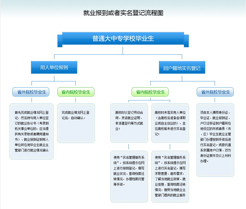 (1)省内院校毕业生离校时以签订劳动合同、灵活就业证明、非派遣签约等方式就业的,使用“实名管理服务系统”,按系统提示在网上进行报到登记,填写就业状况、查询档案迁转情况,办理档案托管等手续。
