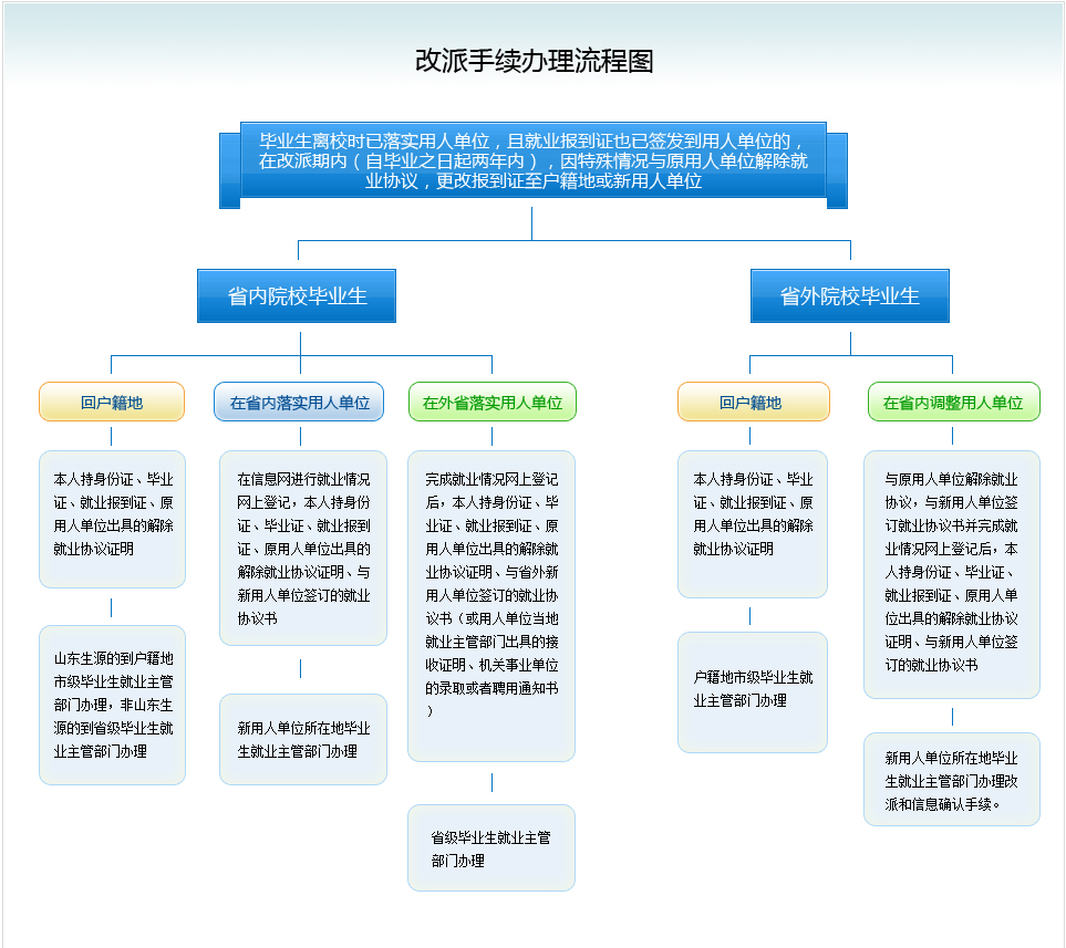 ①省内院校毕业生与原用人单位解除就业协议后回户籍地的,本人持身份证、毕业证、就业报到证、原用人单位出具的解除就业协议证明,山东生源的到户籍地市级毕业生就业主管部门办理改派手续,非山东生源的到省级毕业生就业主管部门办理改派手续。