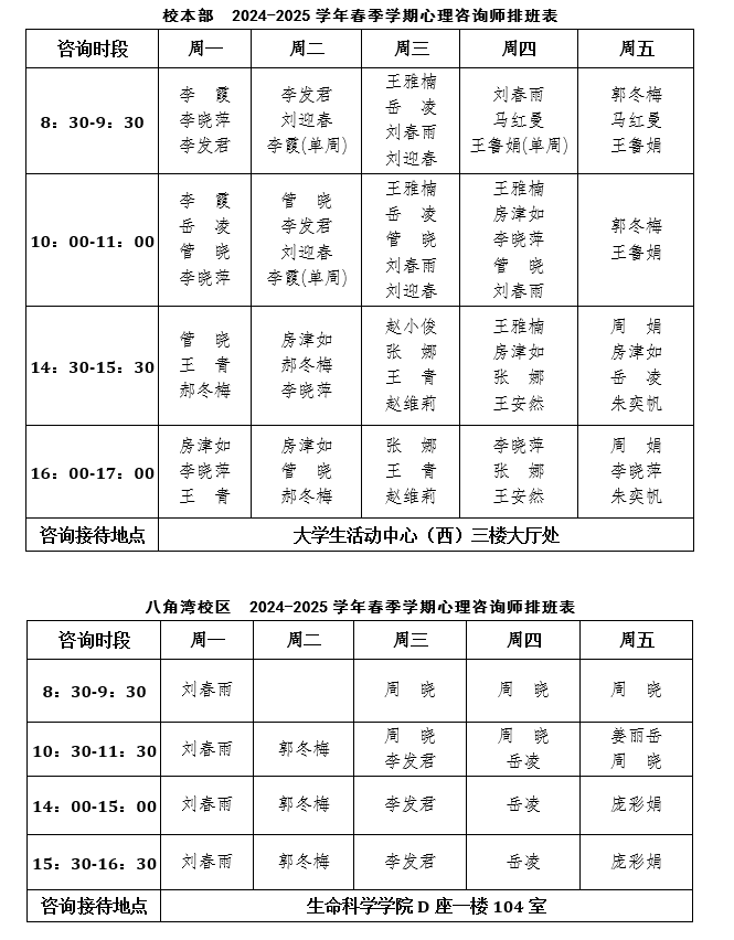 bob体育在线app心理健康教育指导中心2024-2025学年春季学期咨询师排班表